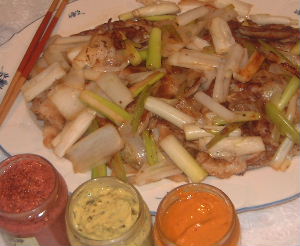 豚肉とねぎのソテー(写真)と3種類(カシス、バジル、ピメントのディジョンマスタード(写真